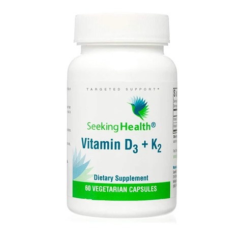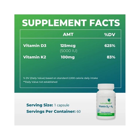 Vitamin D3 + K2 by Seeking Health contains 125 mcg (5000 IU) of D3 (as cholecalciferol) and 100 mcg of K2 (as menaquinone-7) in an easy-to-swallow capsule. The cholecalciferol form of vitamin D3 used in this product is derived from cholesterol in sheep’s wool, making it suitable for vegetarians. Vitamin K2 is provided as menaquinone-7, one of the most studied forms of this important nutrient.*